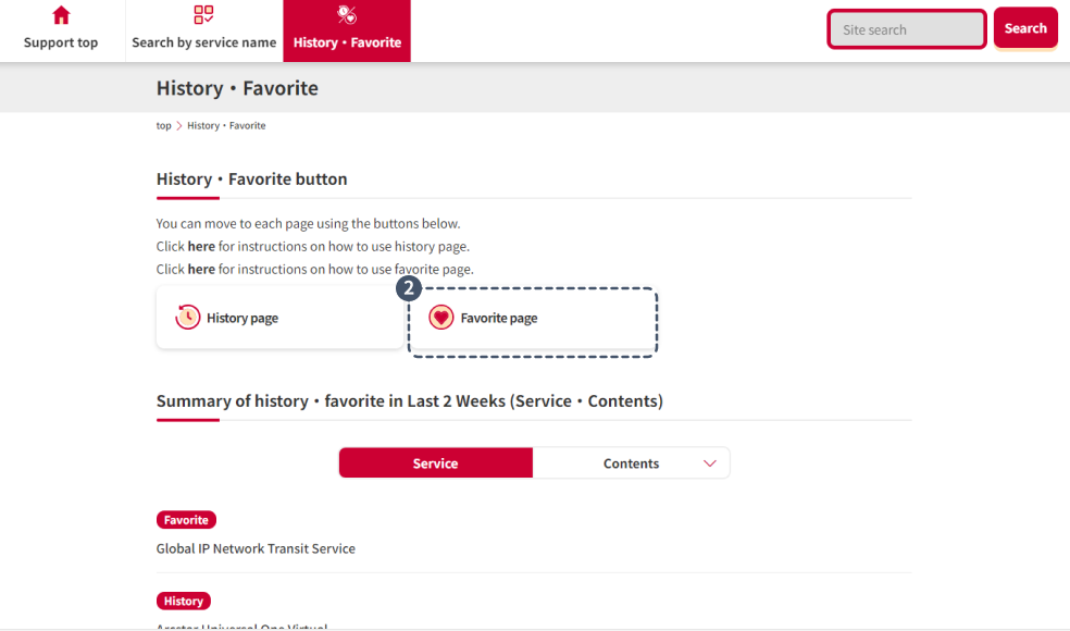 Press the "History & Favorites" button at the top of the customer support site page to move to the page.
