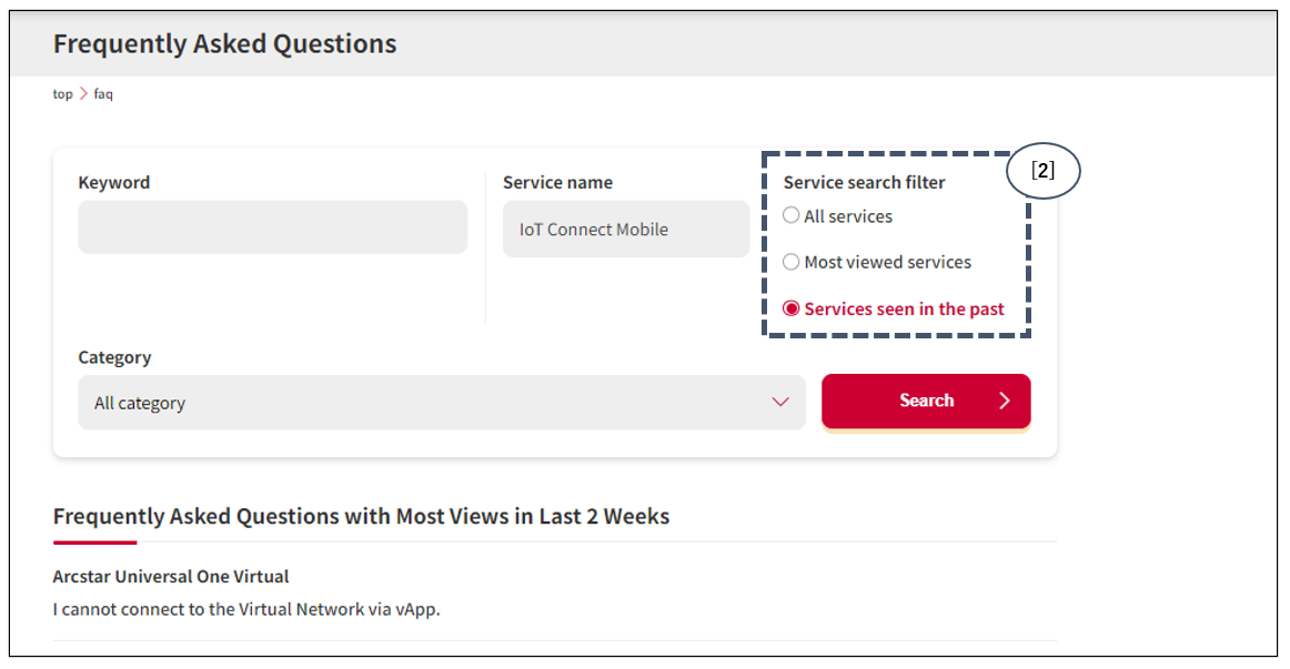 In the filter search area for FAQs, construction/failure information, and various downloads, you can smoothly select services you have viewed in the past and frequently viewed services by using the browsing history feature.