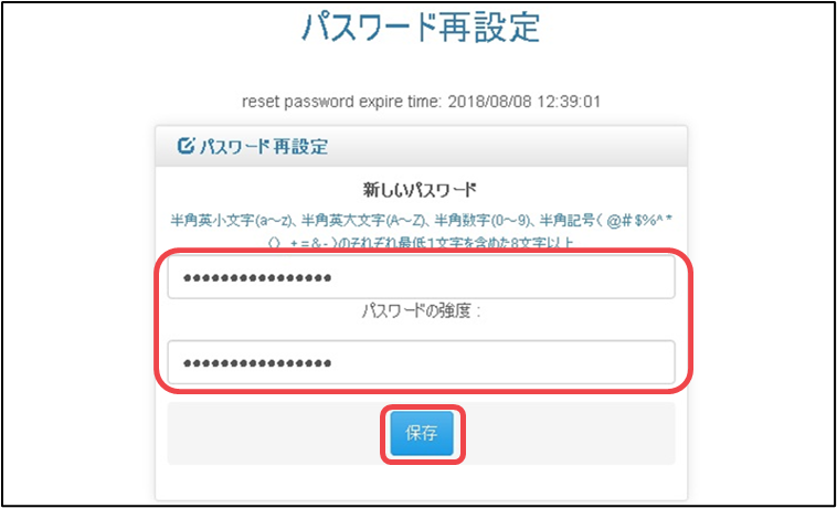 「パスワード再設定画面」で「新しいパスワード」を入力して、[保存]をクリックします。