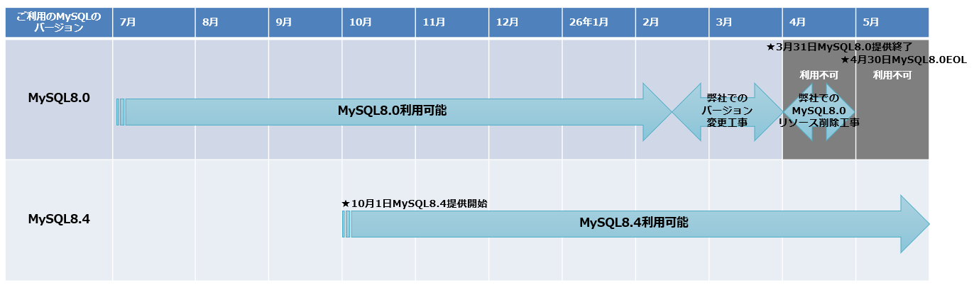 2026年2月中旬までにお客さまご自身でのMySQL8.4へのバージョン変更作業をお願いいたします。