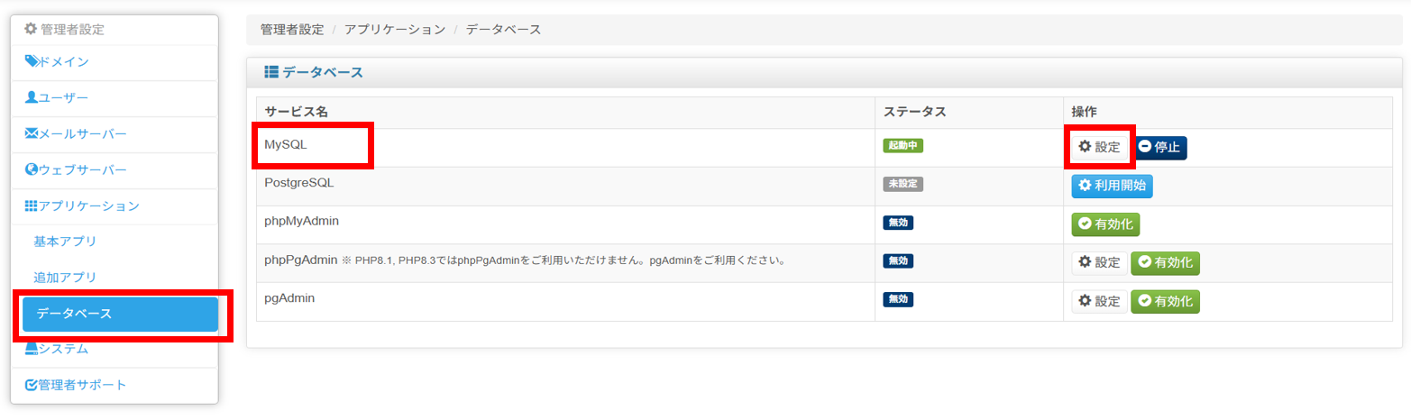 2)コントロールパネルの左メニュー「アプリケーション」から、[データベース]をクリックし、MySQLの設定ボタンをクリックします。
