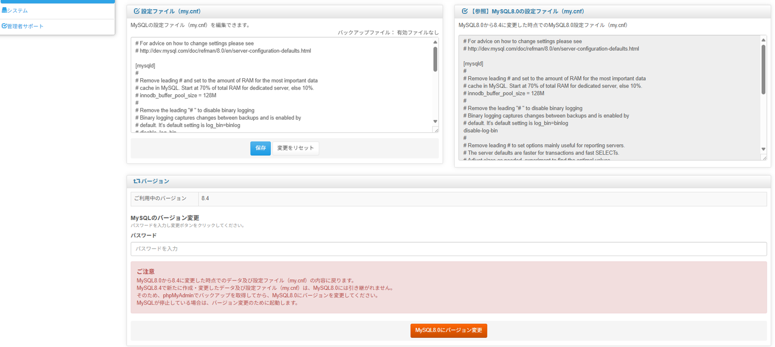 代替バージョンとしてMySQL8.4の提供を開始し、コントロールパネルからMySQL8.4への切り替えを実施できるようにしております。